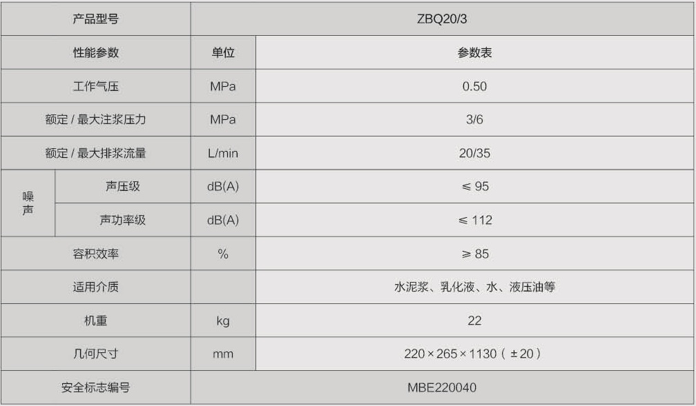 ZBQ-20/3矿用气动注浆泵是综合各类注浆泵的优点新研制的注浆泵,具有体积小、重量轻、效率高、使用可靠、维护方便的优点。该注浆泵为活塞往复式结构,依靠压缩空气为动力源。马达活塞与工作气缸活塞的面积比最高可达12以上,输出浆液压力可达6MPa;通过更换系列工作注浆缸组件,可以获得理想流量的注浆效果。